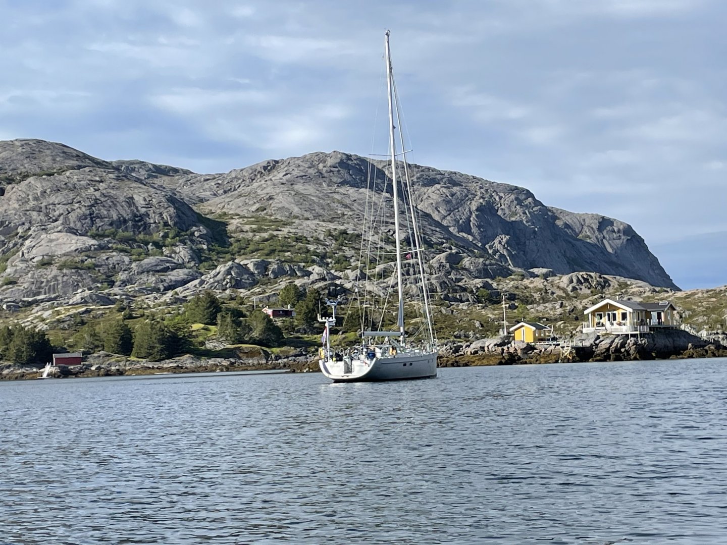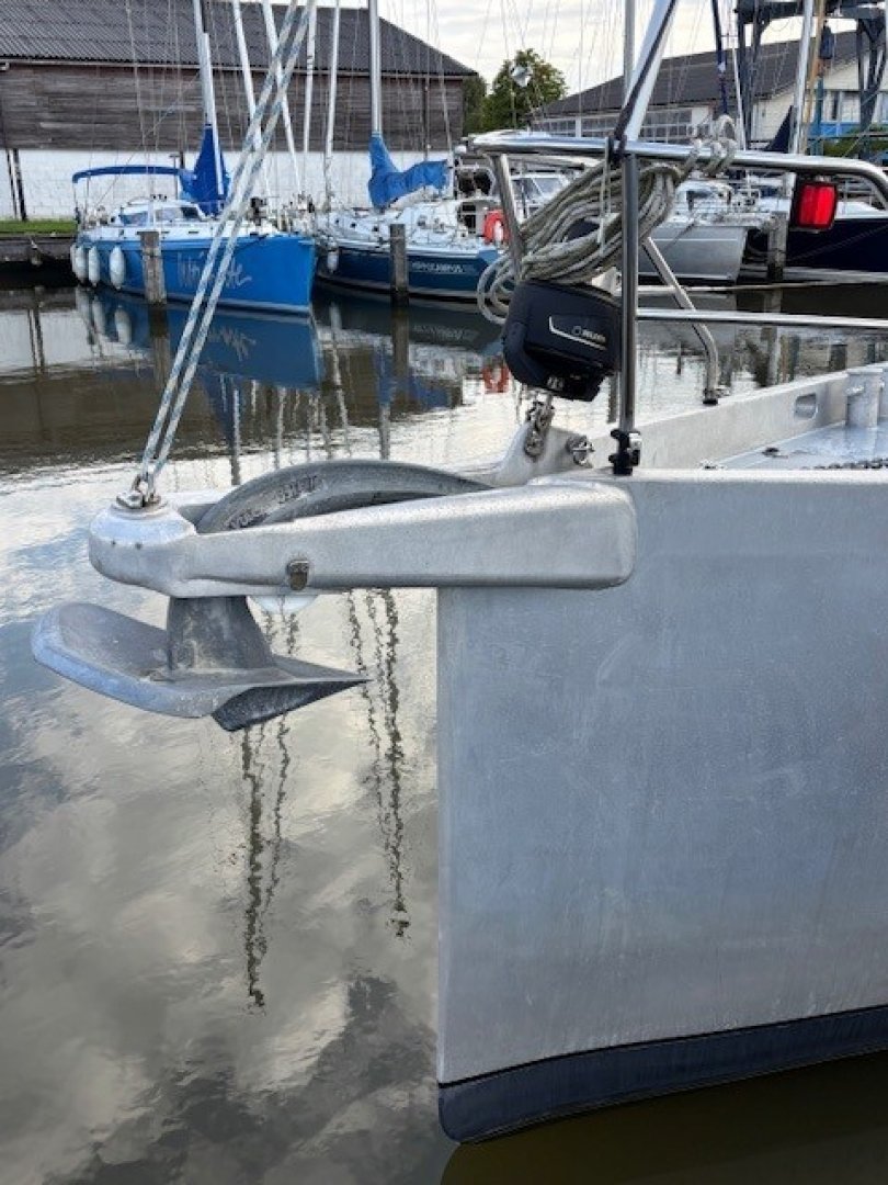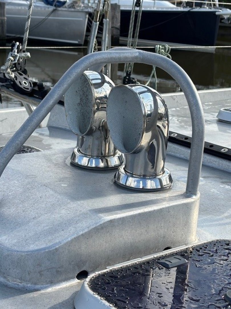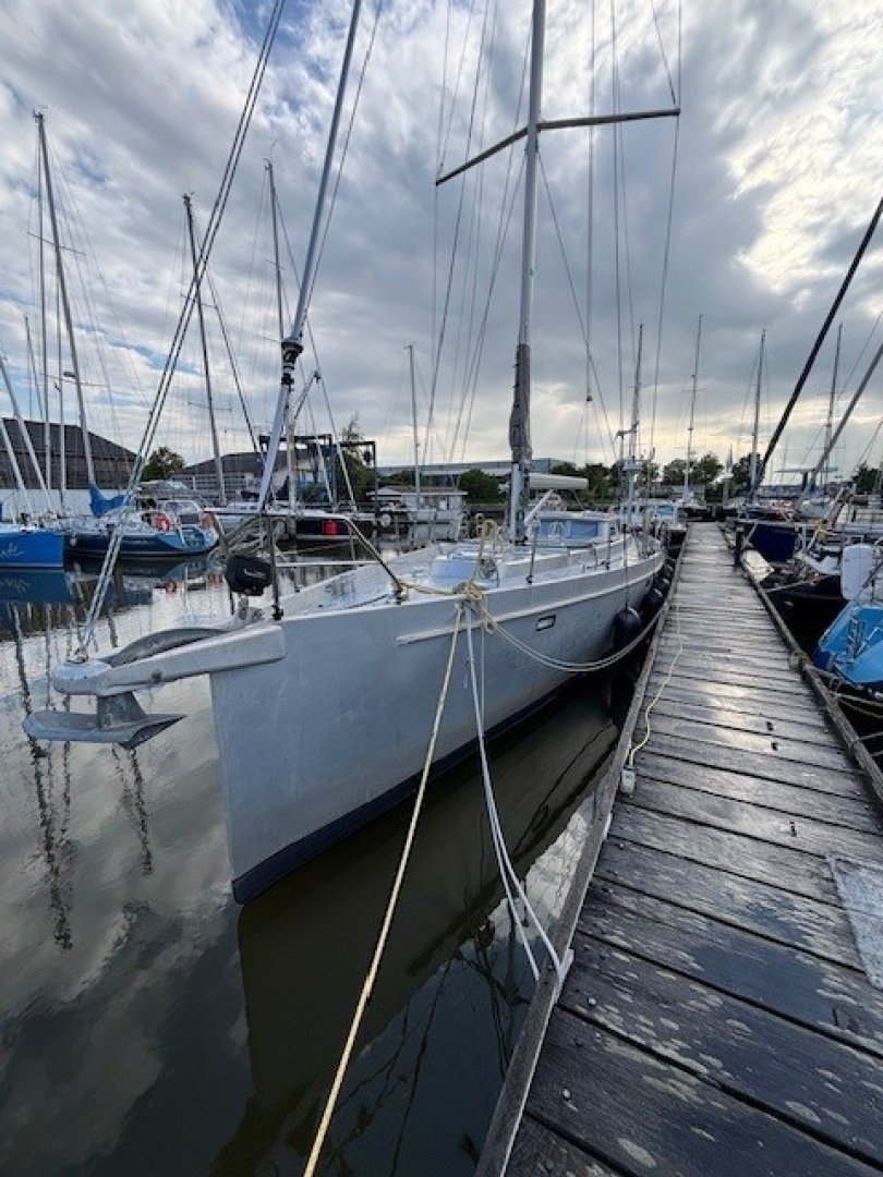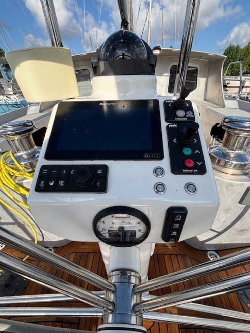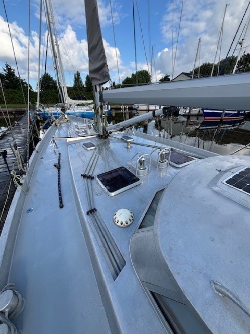 All lines are led back to the cockpit and are within easy reach of the helmsman. The four Andersen cockpit winches are electric. The high-aspect jib is normally sheeted as a self-tacking jib. For long offshore passages, it can also be sheeted conventionally, and a storm jib can be flown from a removable inner forestay. For reaching and downwind courses, the boat is equipped with an Elvström Code sail (permanent hoist, UV-protected) of 97 m² and a Furlström of 137 m² (somewhere between a Code 0 and a gennaker). These sails are flown from a furler on the bowsprit.