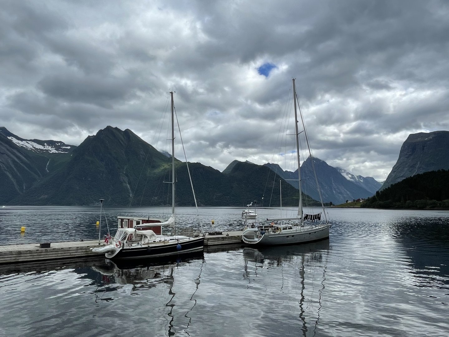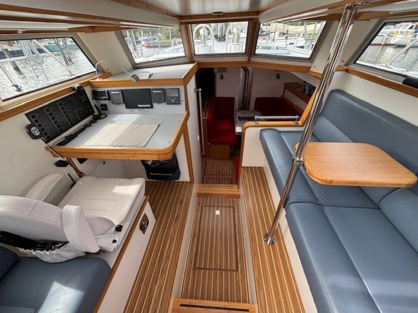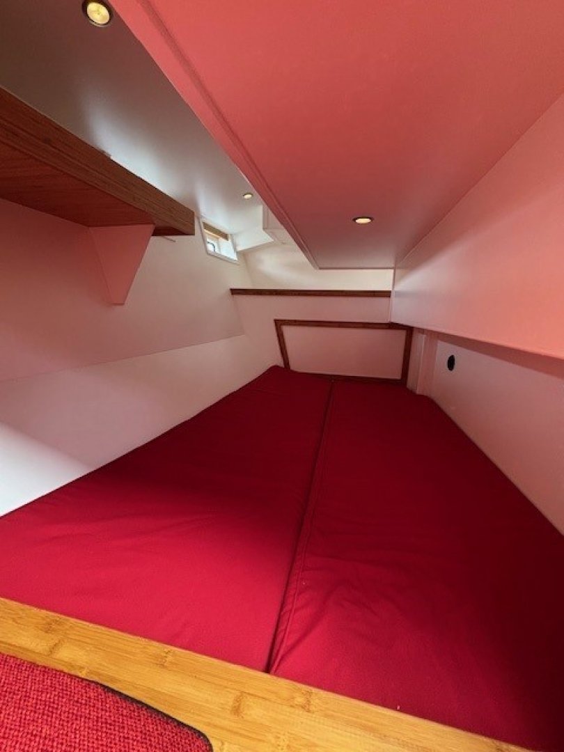 The interior is finished in white with bamboo accents, creating a modern yet cozy atmosphere. The owner’s cabin is located in the bow and features a washbasin and separate shower. The guest cabin, located amidships near the mast, has a bunk bed. A double quarter berth is located aft of the saloon, under the starboard side of the pilothouse. The saloon includes a spacious seating area with table and a linear galley. Handholds are installed throughout the boat for safe movement at sea. Much time—both underway and in harbor—is spent in the pilothouse, which offers 360° visibility and has all instruments within arm’s reach. The bench on the starboard side is long enough to lie down or sleep on.