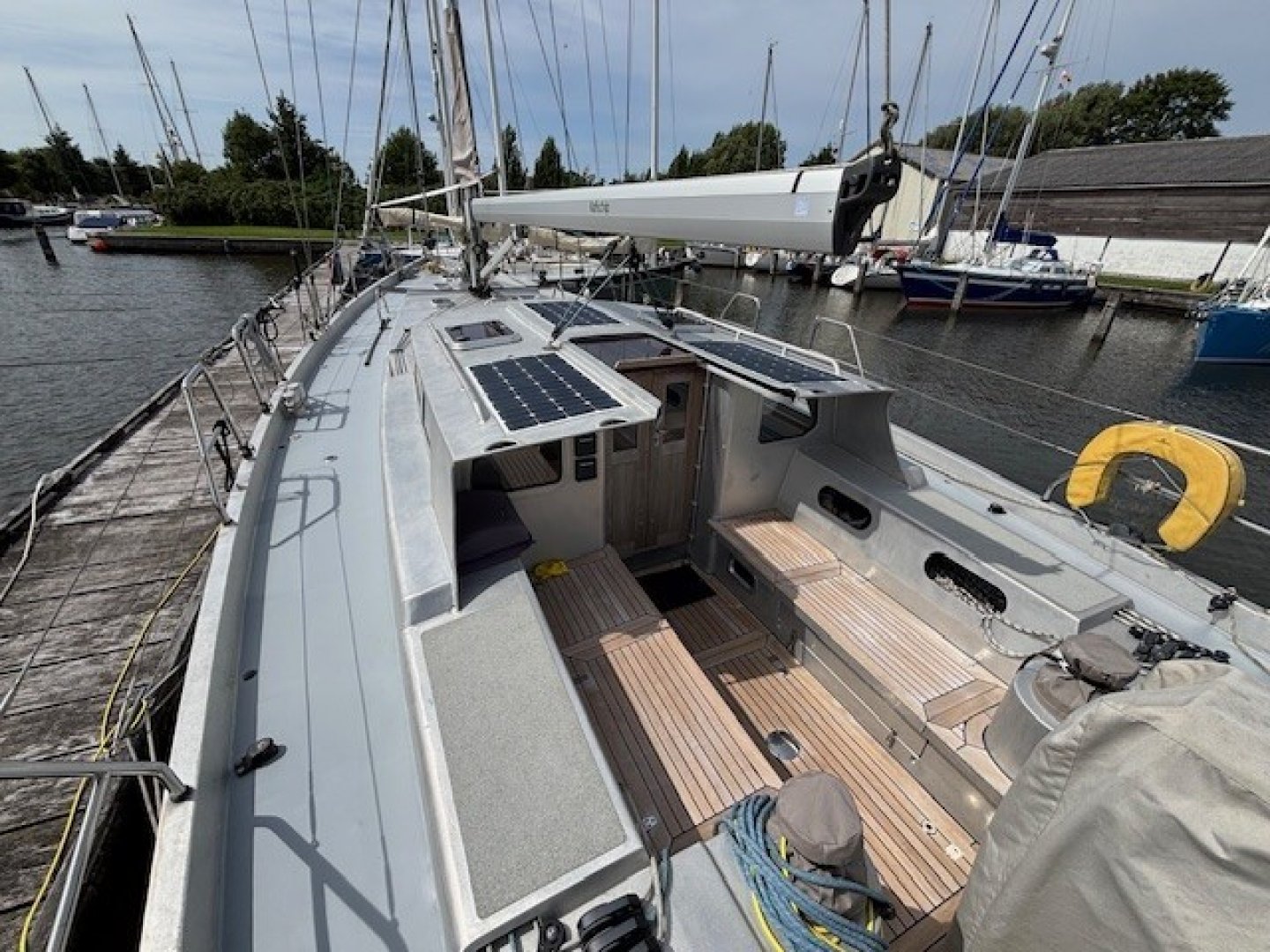 The engine is a Yanmar 4JH4-TCE, 75 HP with saildrive and a Flexofold 3-blade propeller, commissioned in 2019. For improved maneuverability, a third rudder is mounted aft of the saildrive. Additionally, the boat is equipped with a bow thruster and a retractable stern thruster, allowing it to be docked in tight spaces.