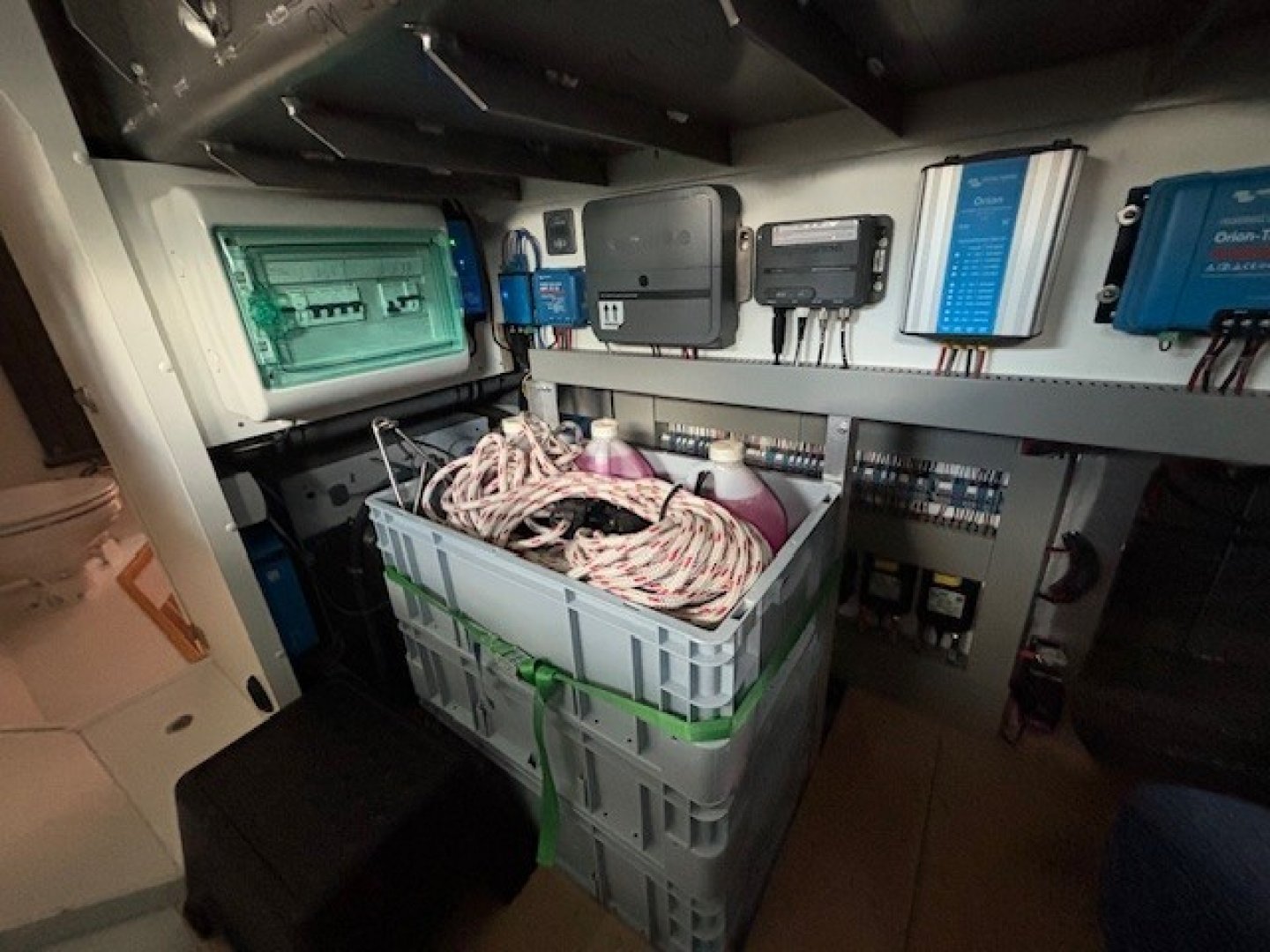 The electrical system (Victron) was modernized in 2024 and largely converted to lithium. The service bank consists of two 24V Victron lithium batteries of 200 Ah each. Two separate AGM battery banks (165 Ah 24V, installed in 2025) are used for the stern thruster and winches, as well as for the bow thruster and anchor winch.