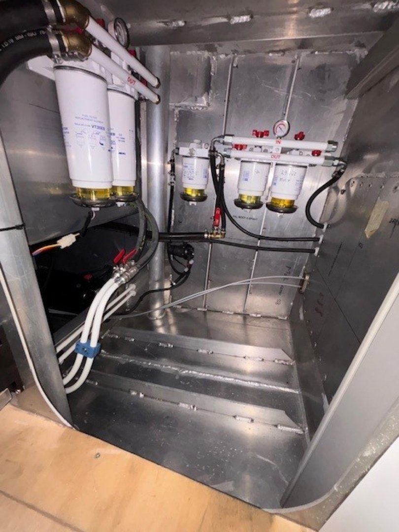 De tankcapaciteit is verdeeld over 2 tanks van ca. 275ltr op het vlak en een dagtank van 160ltr. De dagtank wordt via filters gevuld met een elektrische pomp